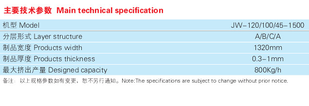公司开发的PP+石粉sheet生产线用以生产多层复合环保片材,主要用以泡罩成型各种食品器皿和包装,如托盘,碗,便当盒,蛋糕盒,水果盘等等等。该装置可以在很大程度上运用石材粉末的百分比,这不仅下降了板材的成本,而且提高了板材的可降解性,并保证了板材的综合物理性能和后续加工性能。
